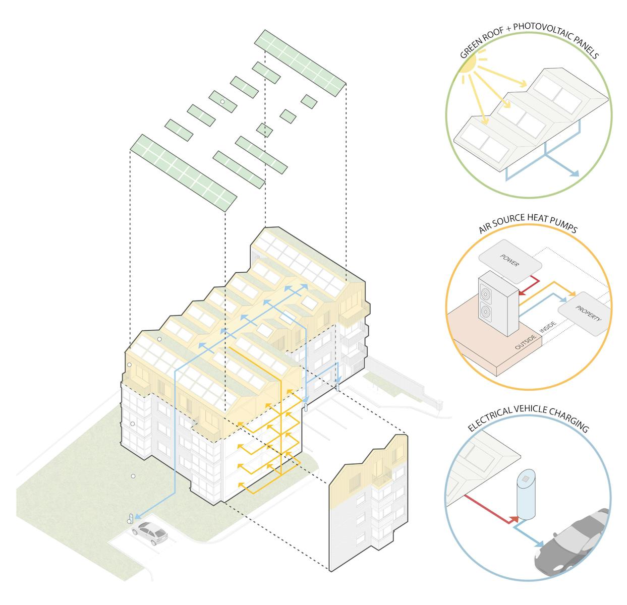 The building is designed in collaboration with structural engineers Webb Yates and a vertically integrated CLT provider, who will manufacture, supply and construct it. It is environmentally efficient: the high-performing thermal envelope brings the building to Passivhaus standards, and air-source heat pumps and photovoltaics will meet the energy demand. It will also last, the accoya cladding chosen for its long-term durability.