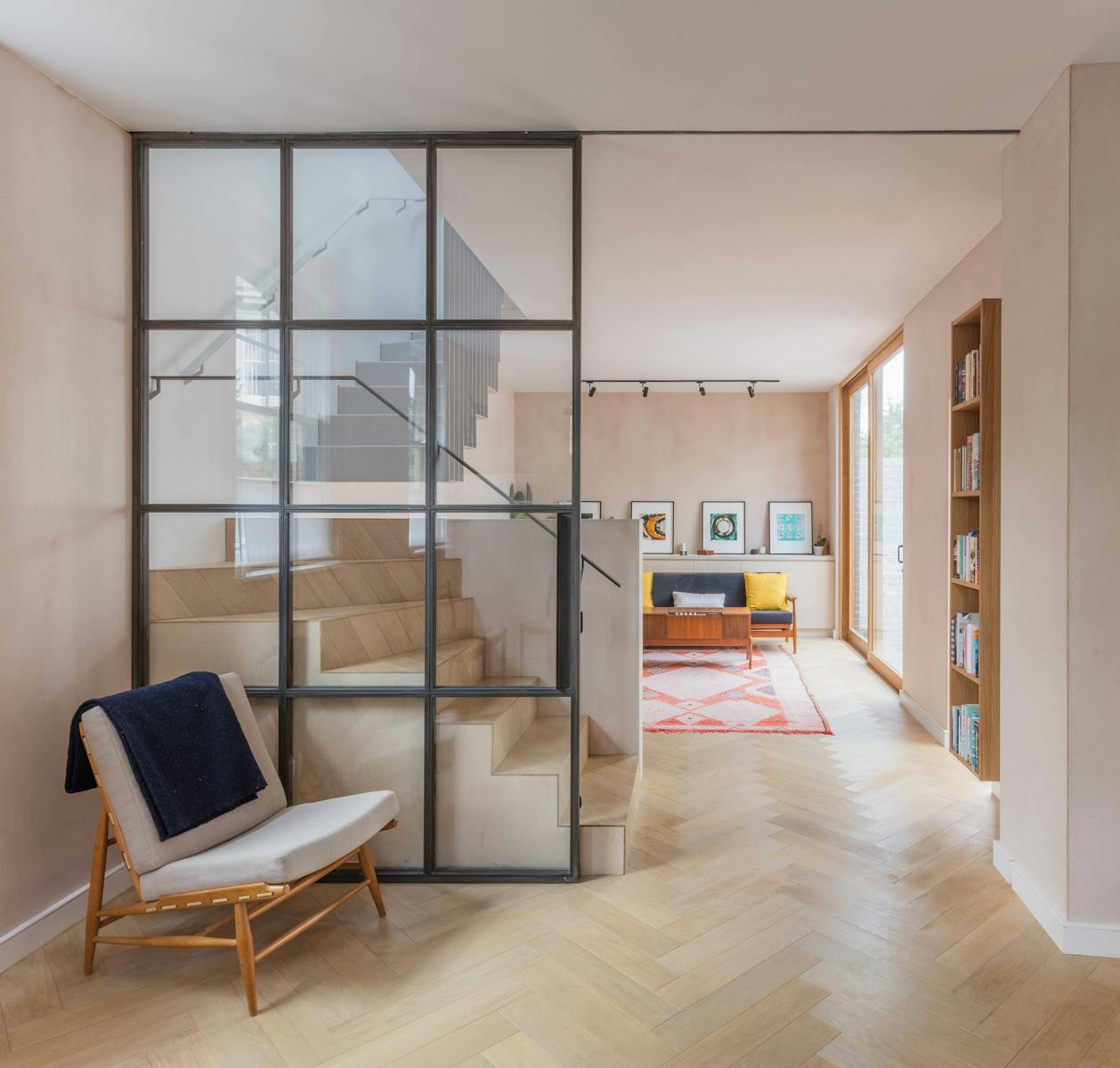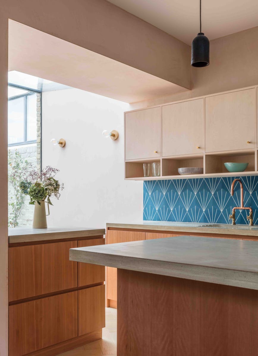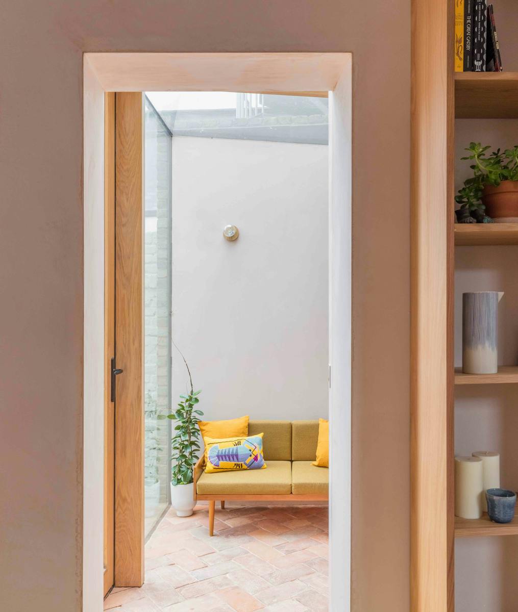 Our refurbishment and reconfiguration of the building began by creating an open-plan living space on the ground floor, maximising the volumes and sense of connection in this otherwise modestly sized house. We added a small extension – a garden room built with a light touch, with floor and wall finishes continuing from the inside out. Throughout, we celebrated natural, untreated materials, finished with a handmade texture and grain. Many of them are reclaimed, including oak for the floor and doors and eco-concrete (with recycled aggregate) for the worktops.
