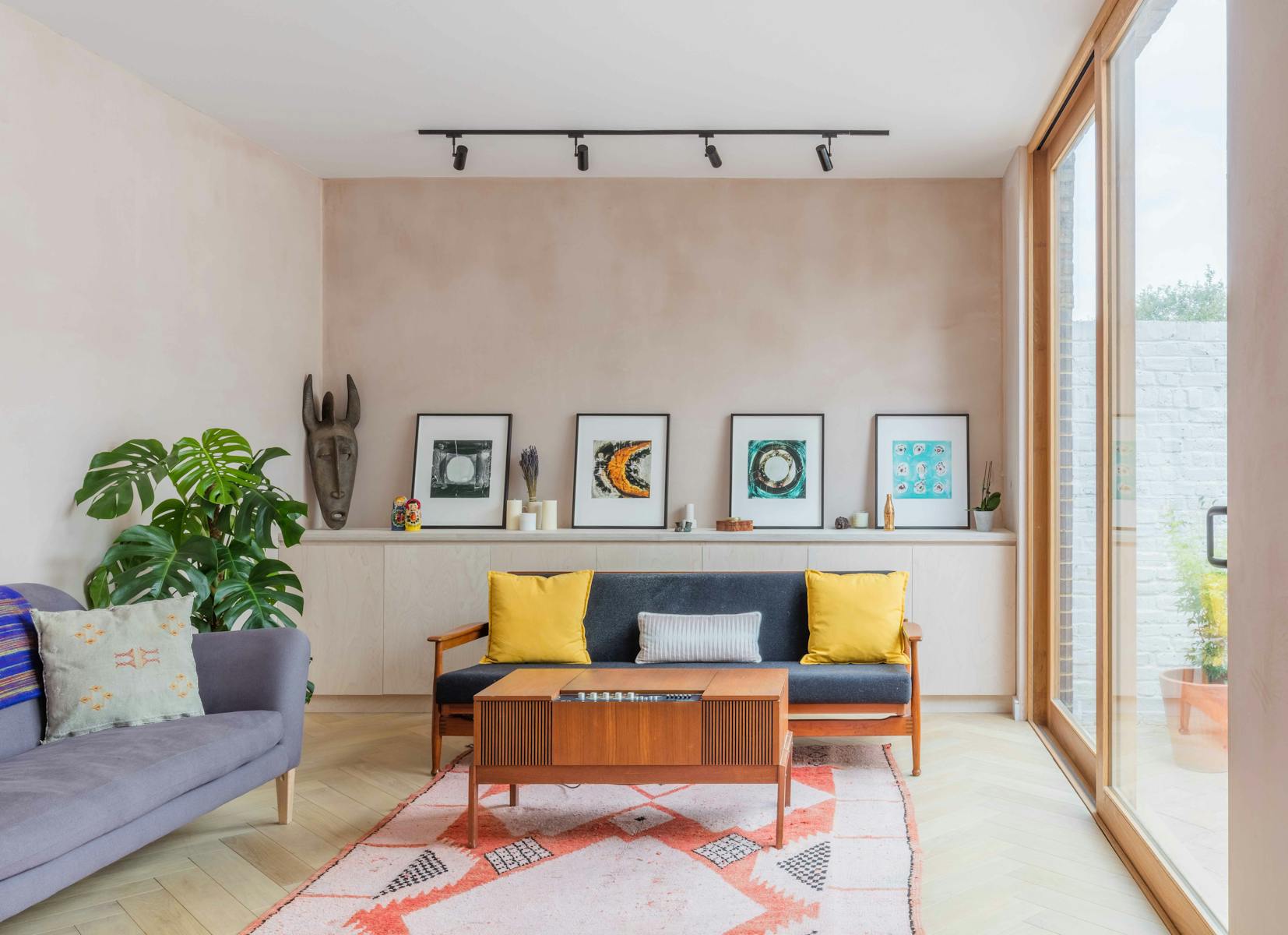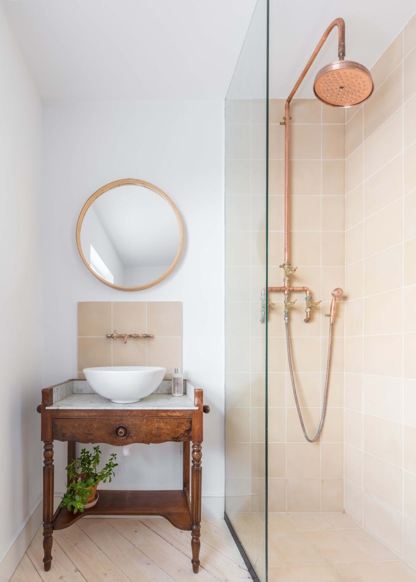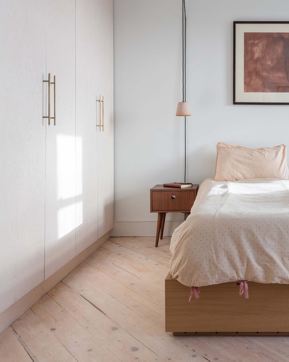 Our refurbishment and reconfiguration of the building began by creating an open-plan living space on the ground floor, maximising the volumes and sense of connection in this otherwise modestly sized house. We added a small extension – a garden room built with a light touch, with floor and wall finishes continuing from the inside out. Throughout, we celebrated natural, untreated materials, finished with a handmade texture and grain. Many of them are reclaimed, including oak for the floor and doors and eco-concrete (with recycled aggregate) for the worktops.
