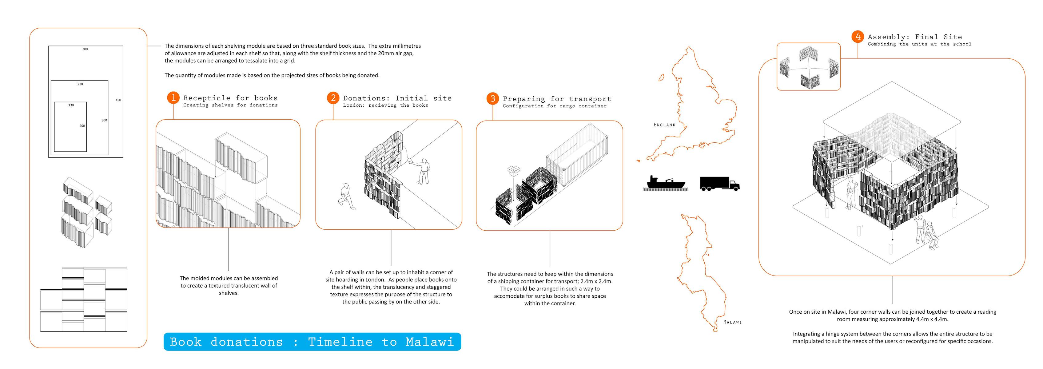 The sponsors of this project were a consortium of construction industry organisations who supported a Unicef initiative to improve opportunities for children in Malawi. We designed a series of modular bookshelves that could be prefabricated, transported and easily constructed into small, yet adaptable, school libraries.