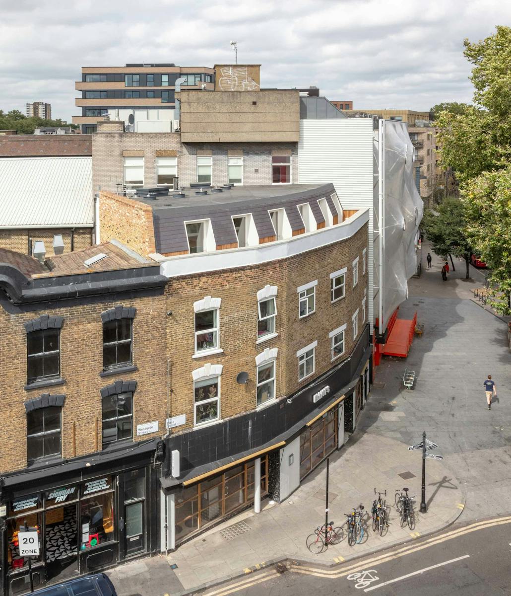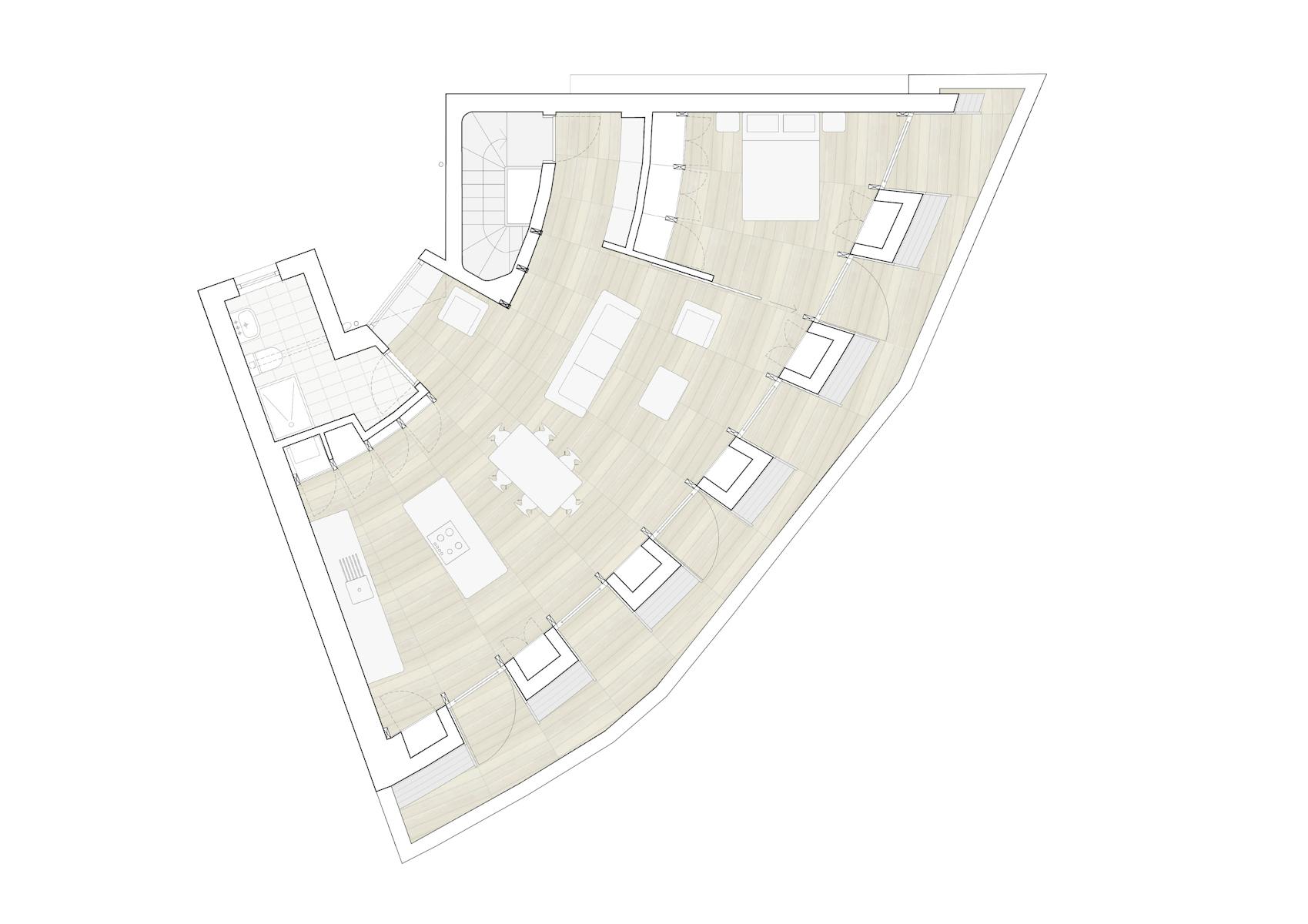 Being on the intersection of two roads gives this existing block of 4 flats and ground floor restaurant a curve to the facade of the terrace. Our lateral upward extension looked to follow two corresponding curves in plan - one tracking the front facade and the other to the rear facade. This creates both rhythm and difference with the arcs tapering along differing paths.