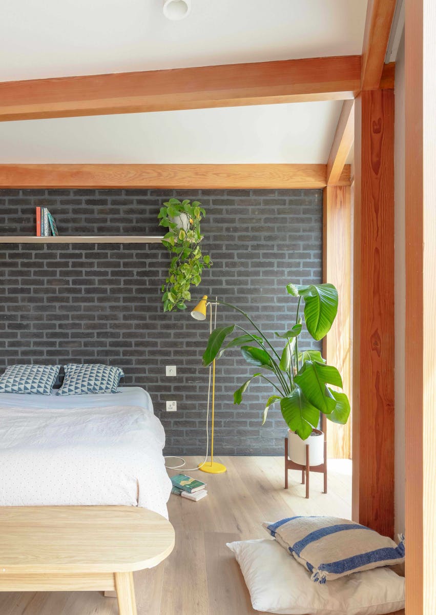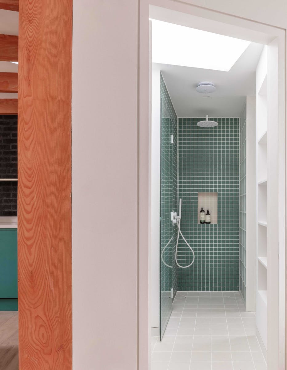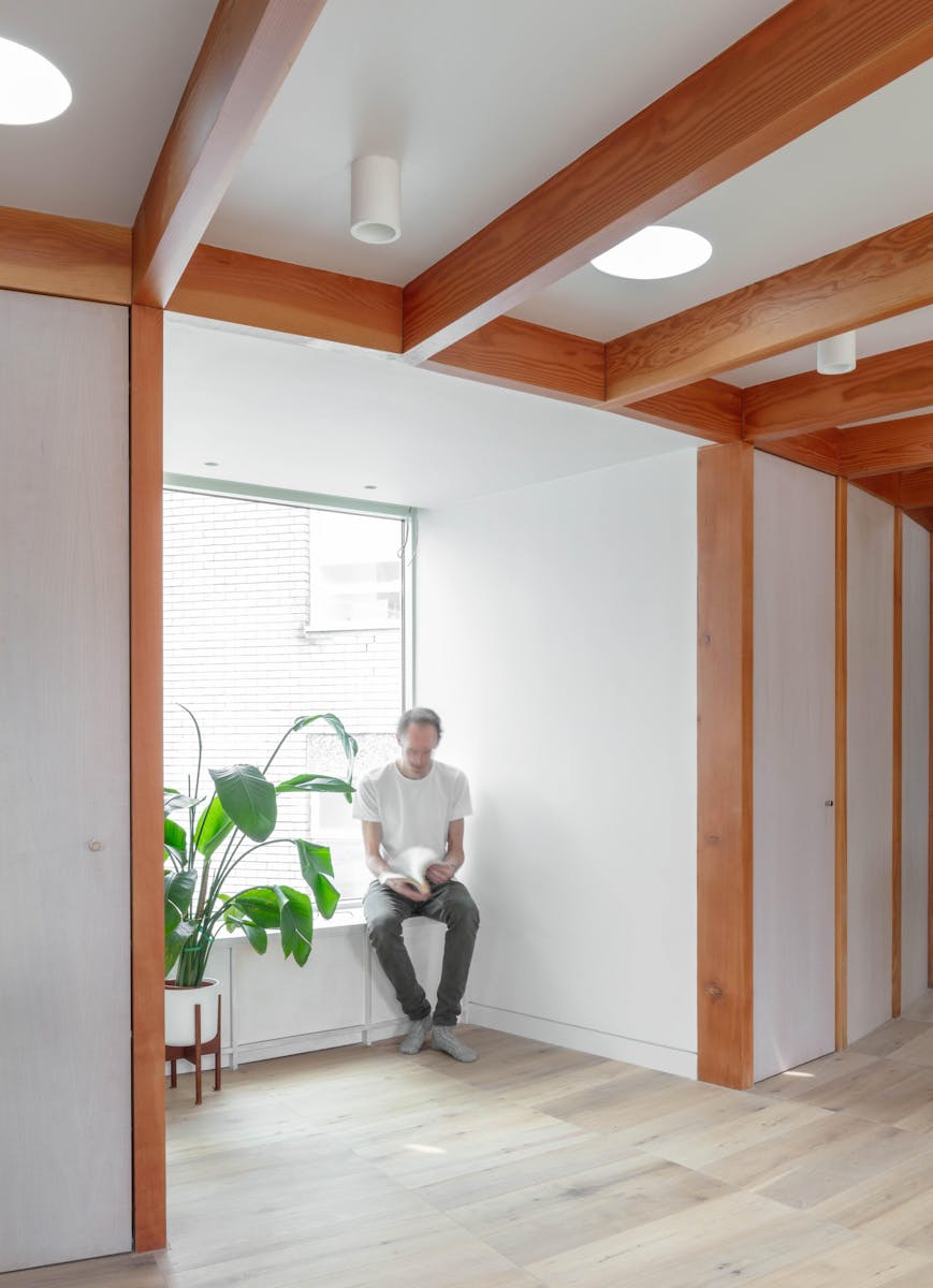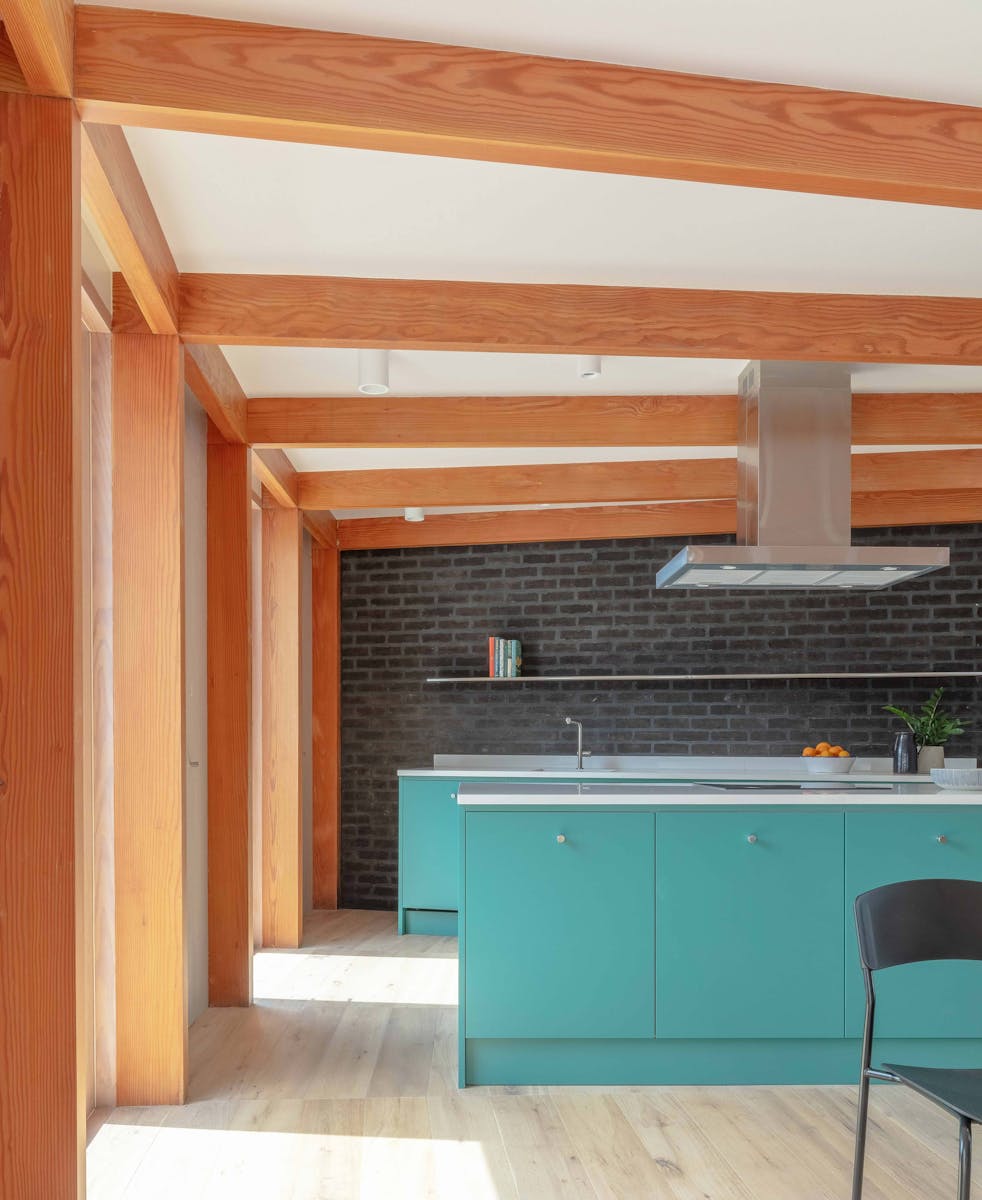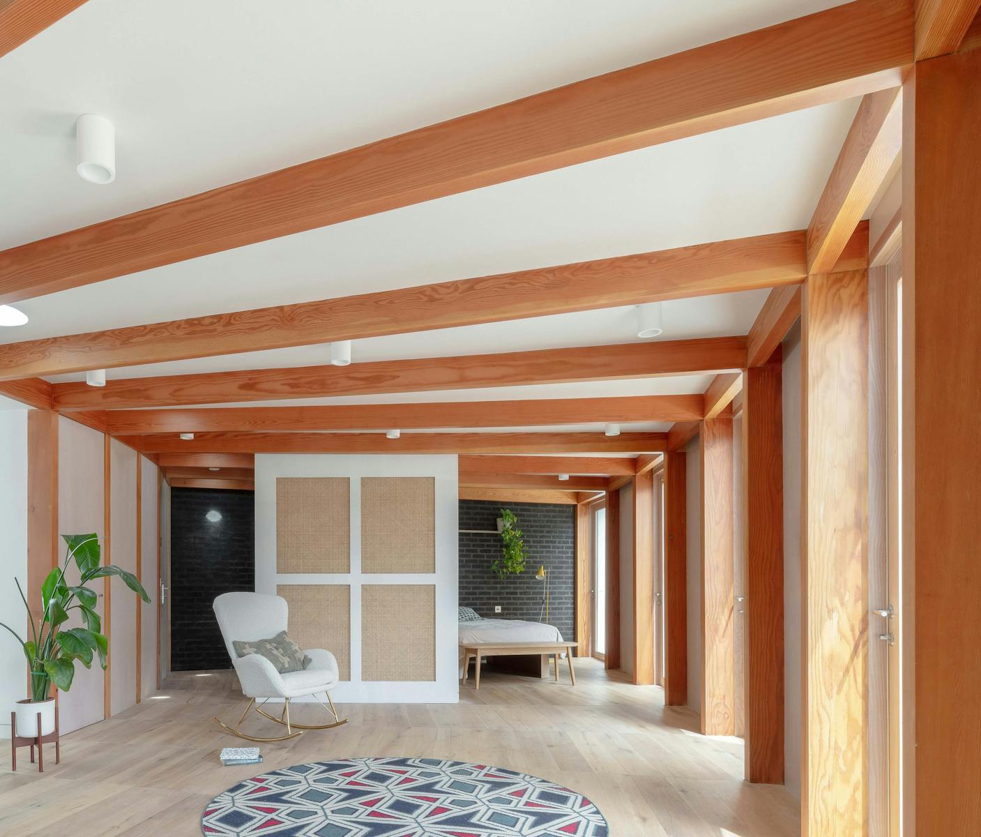 The exposed douglas fir post and beam superstructure creates interest and warmth in a free flowing space. The sweeping radial array acts as the setting out of all associated elements, the doors and integrated cupboards all fitted to suit and the floor pattern also following the roof structure. Circular roof lights provide pockets of natural light towards the rear of the plan and the sweeping staircase up to the new apartment. Timber and brick provide varying texture to the feel of the internal spaces. Integrated benches in the hallway and as a window seat offer a place to rest and a sliding screen to the bedroom provides a flexibility of layout.