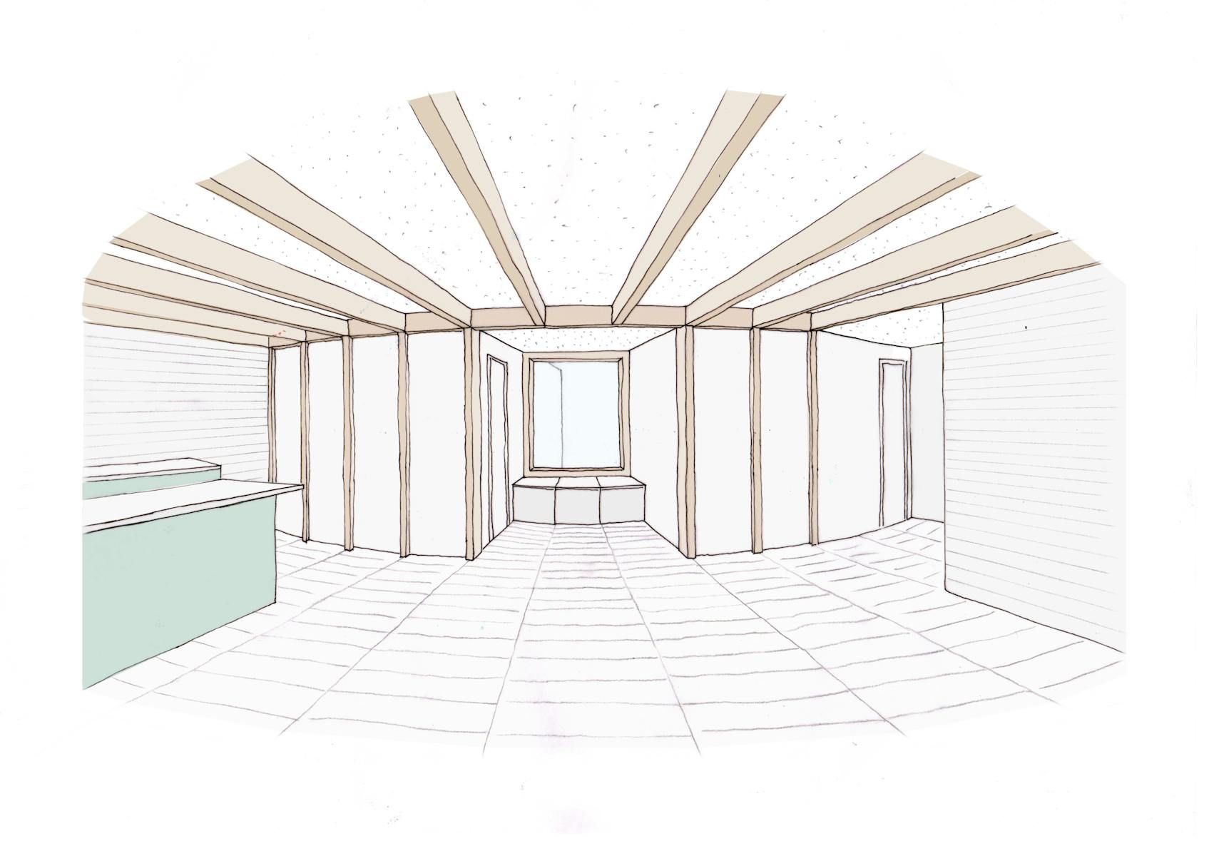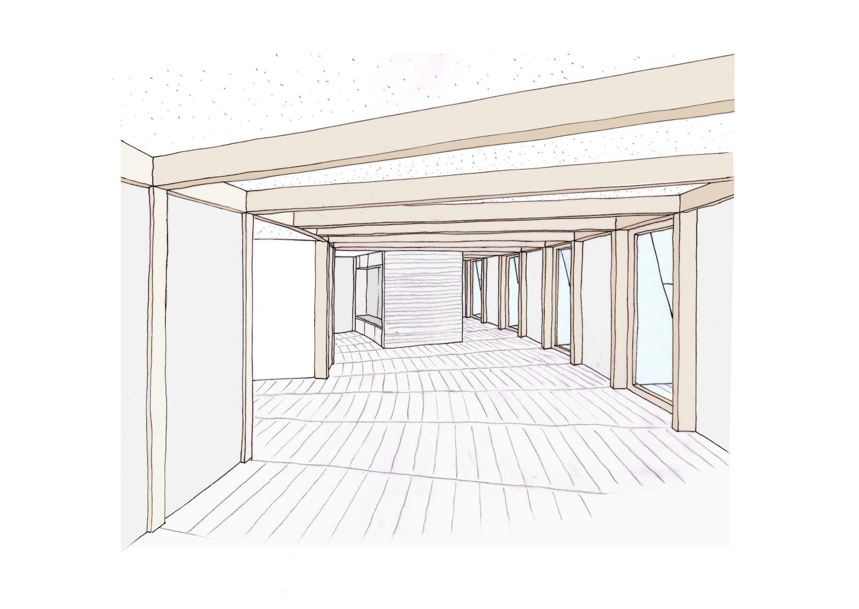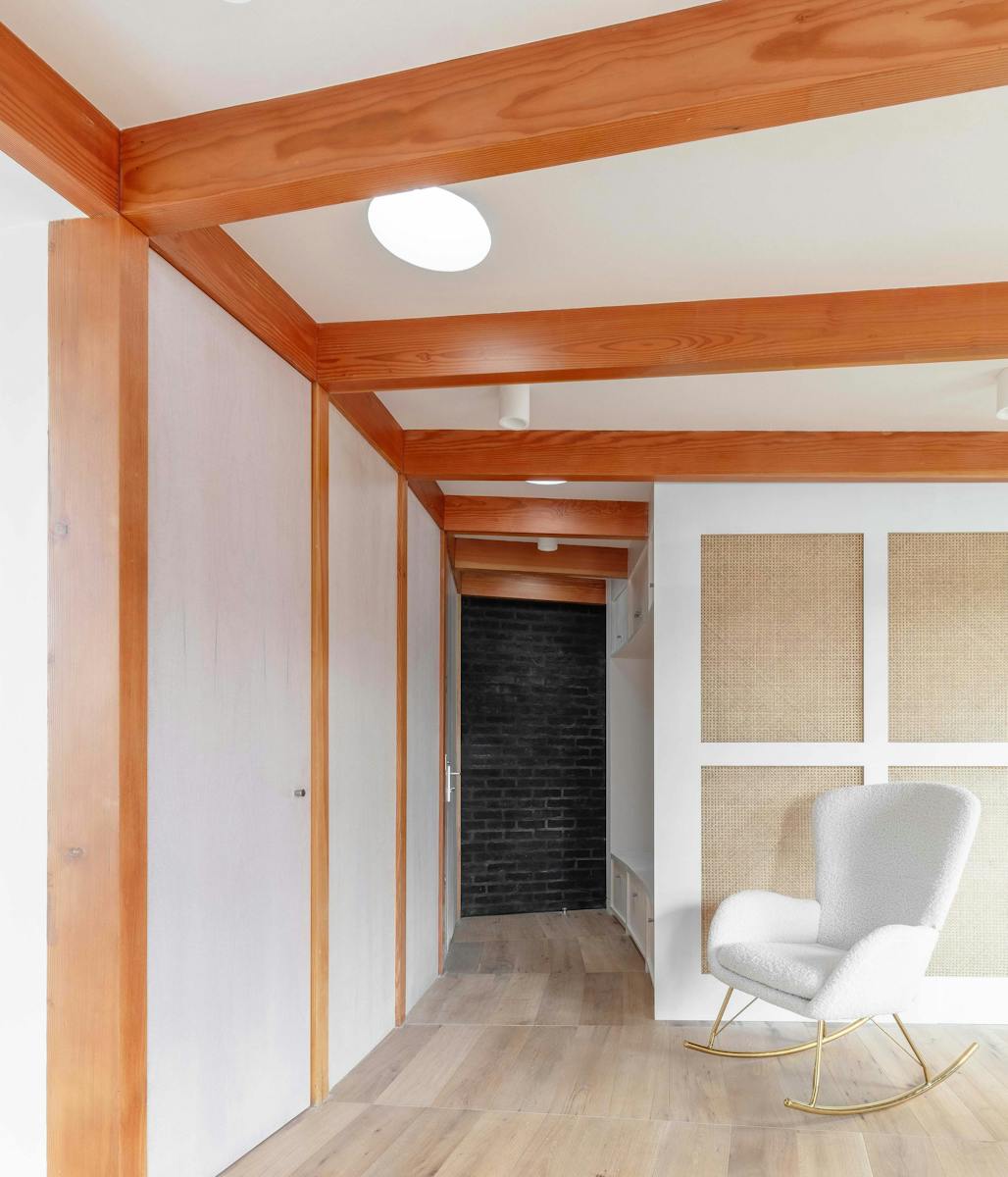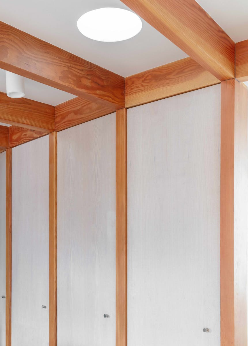 The exposed douglas fir post and beam superstructure creates interest and warmth in a free flowing space. The sweeping radial array acts as the setting out of all associated elements, the doors and integrated cupboards all fitted to suit and the floor pattern also following the roof structure. Circular roof lights provide pockets of natural light towards the rear of the plan and the sweeping staircase up to the new apartment. Timber and brick provide varying texture to the feel of the internal spaces. Integrated benches in the hallway and as a window seat offer a place to rest and a sliding screen to the bedroom provides a flexibility of layout.