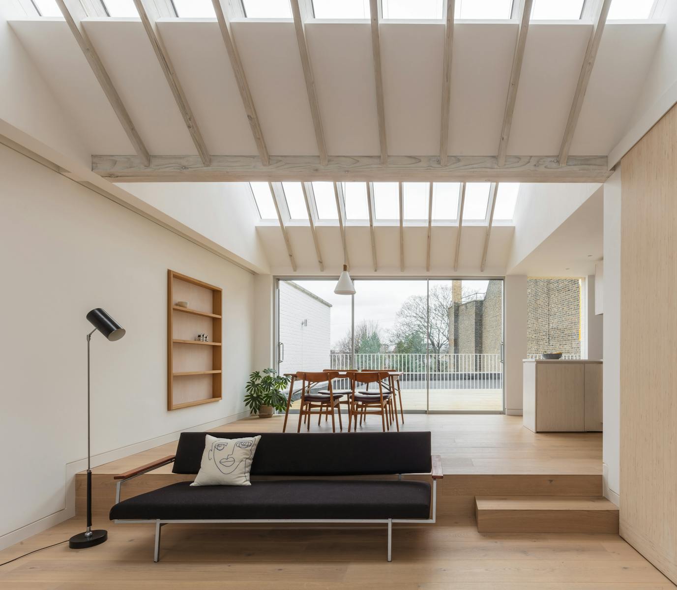 A change of floor level and valleys in the pitched roof help to reinforce these zones, the resulting undulating ceiling height animating the space. We added wall-to-wall rooflights which wash the apartment with soft north light. Outside, a vivid yellow spiral stair contrasts with the simple oak finishes and pale brickwork, leading up to a private elevated terrace on the rooftop.