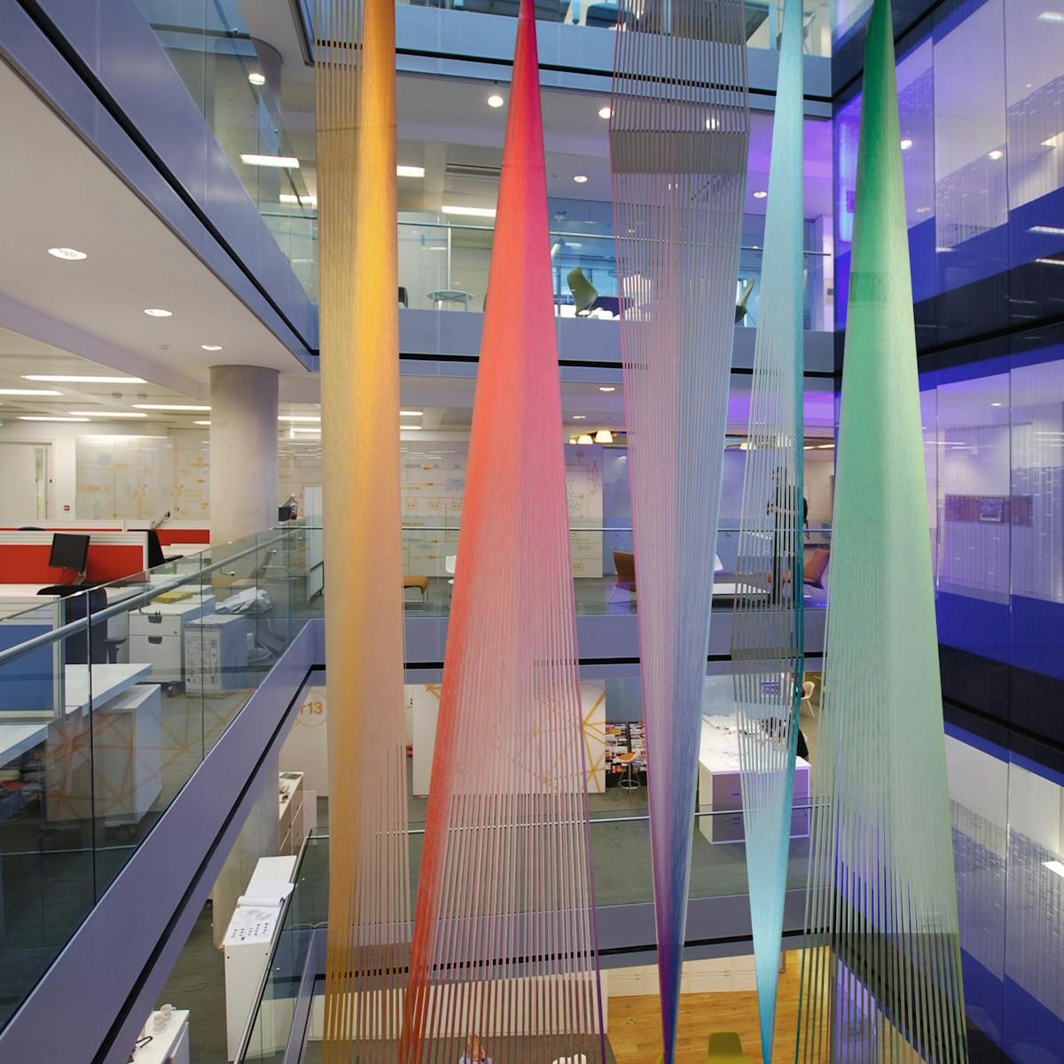 With a brief entitled ‘Designing for People’, we wanted to find a design that would fill the seven-storey atrium and connect to staff and visitors in a direct and playful way. We used two materials – steel and brightly coloured cord – to create a series of 24-metre-high swings. Each array of cords has a varying number of intermediary steel hoops along its length around which the cord is woven, and each swing has a varying mass, moving in a pendulum motion according to the position and number of the steel rings.
