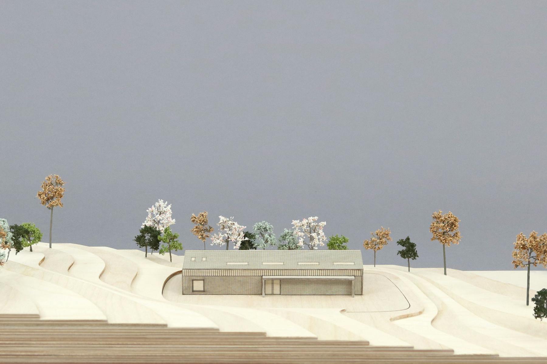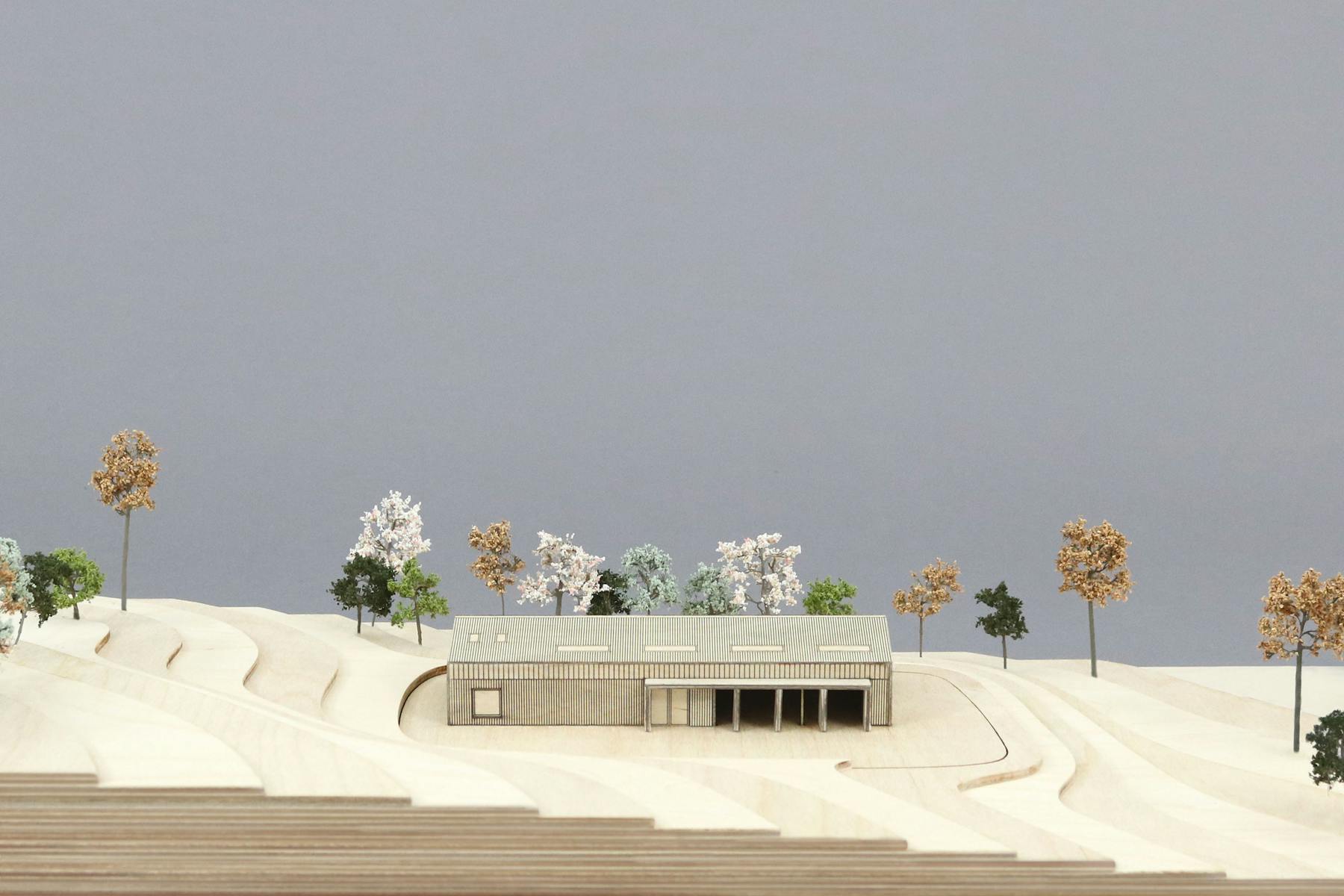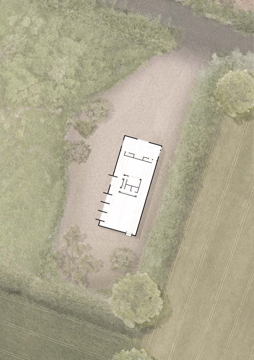 A gallery is by definition an inward-looking building, designed to display what sits within. This accords with the design of an agricultural shed, which doesn’t need to have a visual connection with its surroundings. Internally, the steel portal frames and roof form are exposed, and the internal partitions fully flexible to allow for three different scales of artistic display or production. One small gesture disrupts the introvert quality of the building. Seeing an opportunity to link the internal exhibition space to an external sculpture garden, we added industrially scaled pivoting doors which can be opened during the summer months to create a more free-flowing connection between inside and out. The entire volume is clad in reclaimed larch.